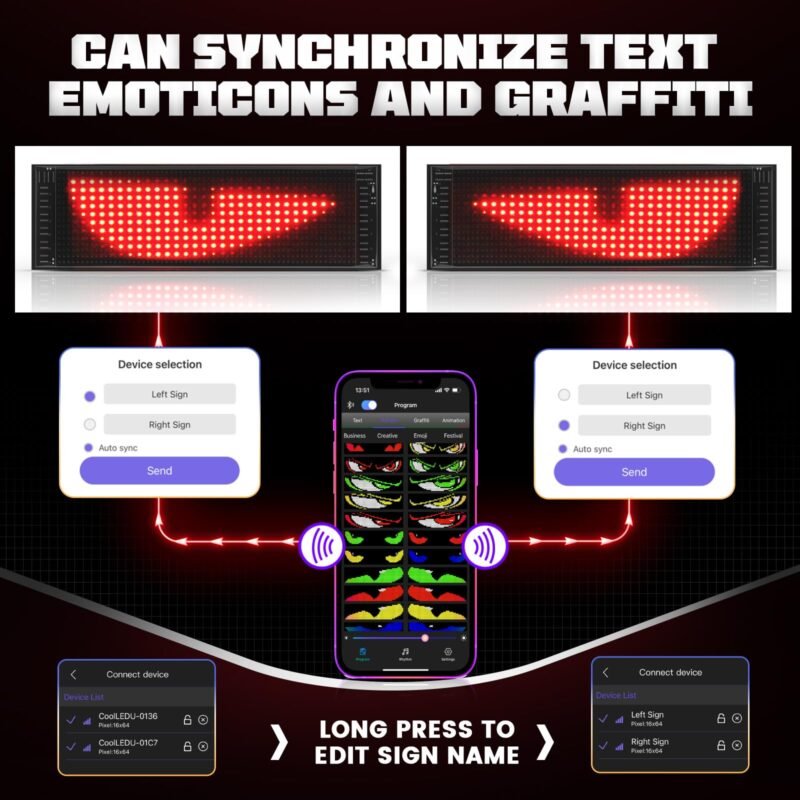 • 【Versatile for Any Occasion】: These devil eyes light aren’t just for cars! Use programmable led sign for parties, birthdays, proposals, halloween, or even as eye-catching business signage. Create custom text, dynamic pictures, and even rhythm background for a truly immersive experience.